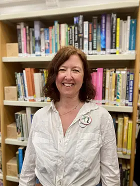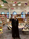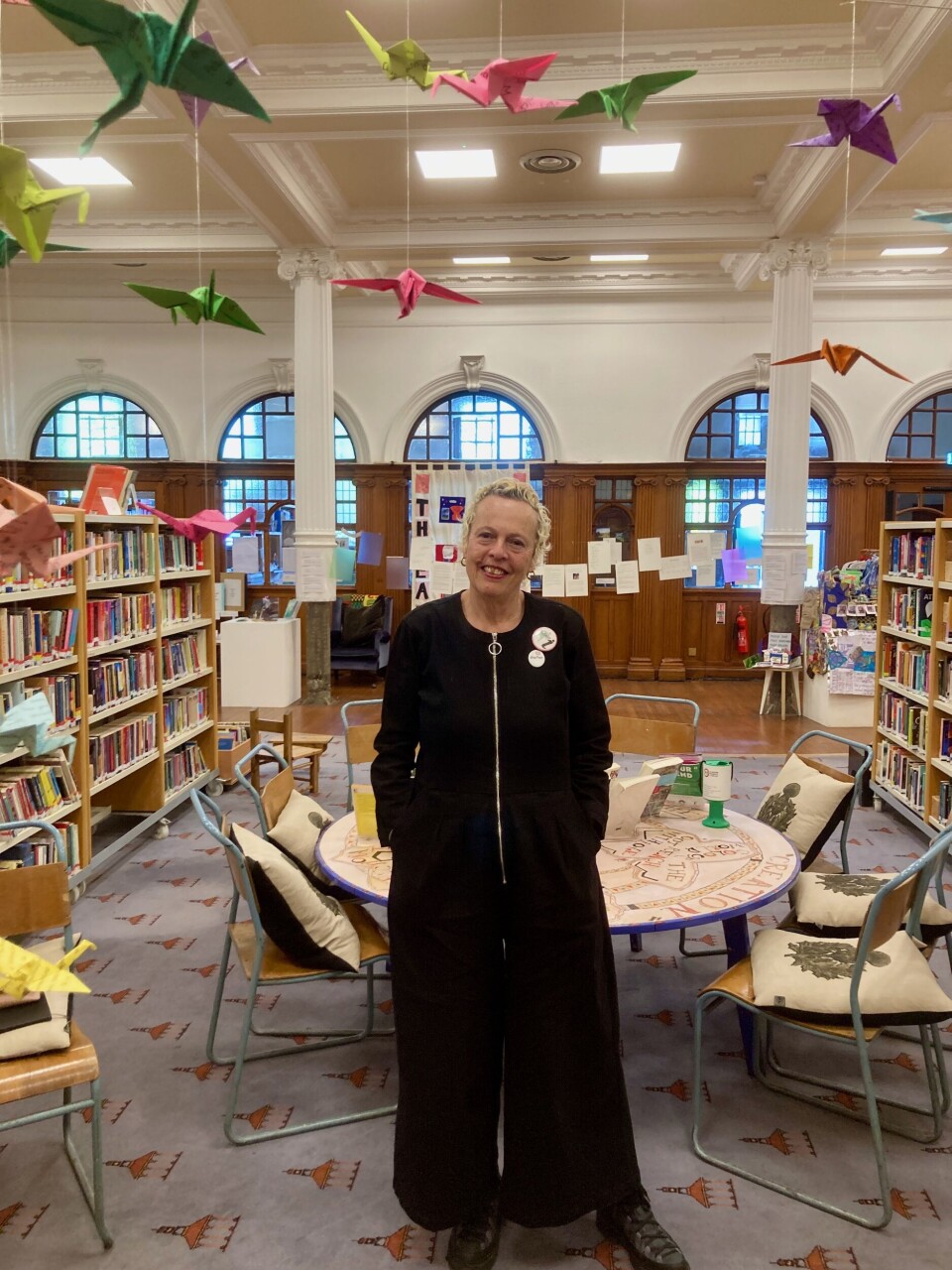 Bibliotekets med-grunnlegger og co-direktør, Adele Patrick, sitter selv av og til i velkomstskranken.