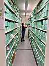 Patrick skrider energisk mellom reolene. Hun forteller om GWLs punk-aktige begynnelse på slutten av 1980-tallet.