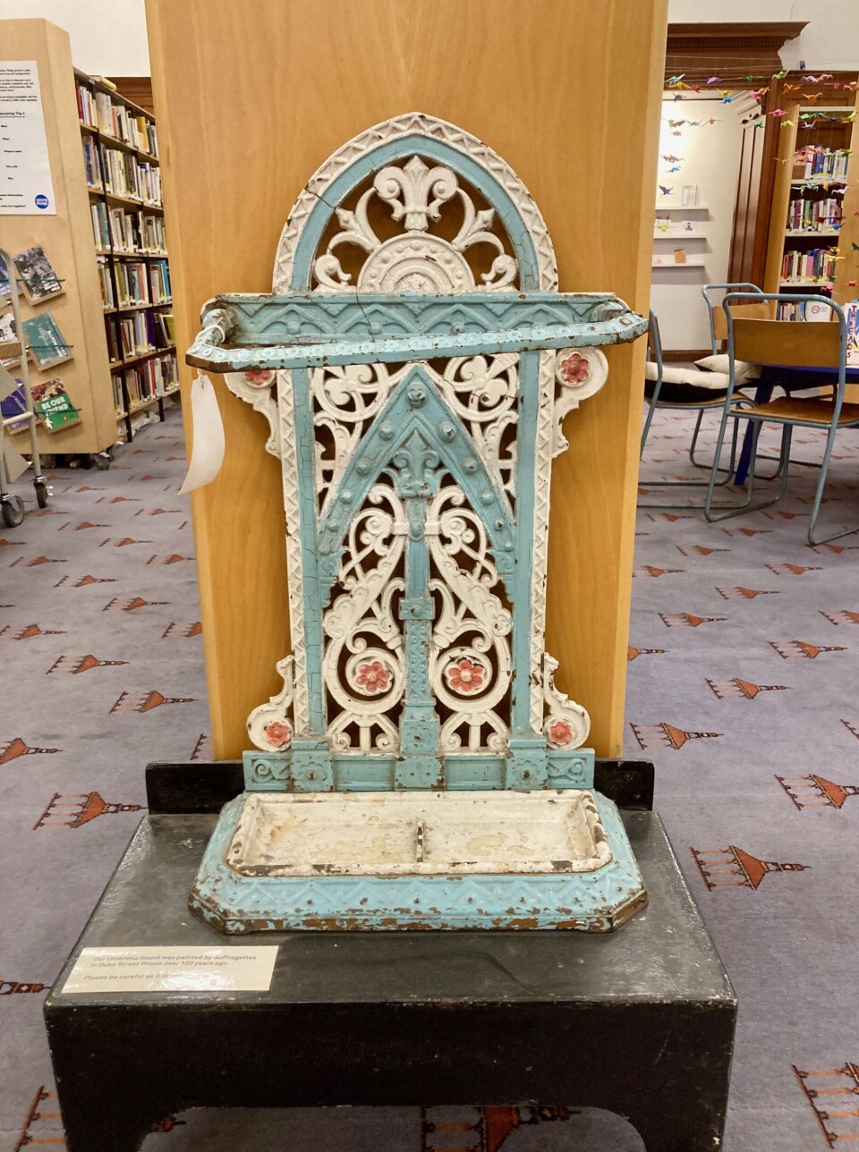 Hun peker forbi bibliotekskranken, mot en stort luftig rom. I bibliotekets tidligere dager var dette lesesal kun for menn. Nå er rommet multibruks møteplass: Her er utstillinger og her holdes blant annet «Story Cafe», høytlesning for voksne, to ganger i måneden. Da dekker bibliotekar Wendy Kirk opp med kjeks og te i en gedigen brun kanne og leser høyt fra aktuelle tekster.