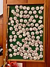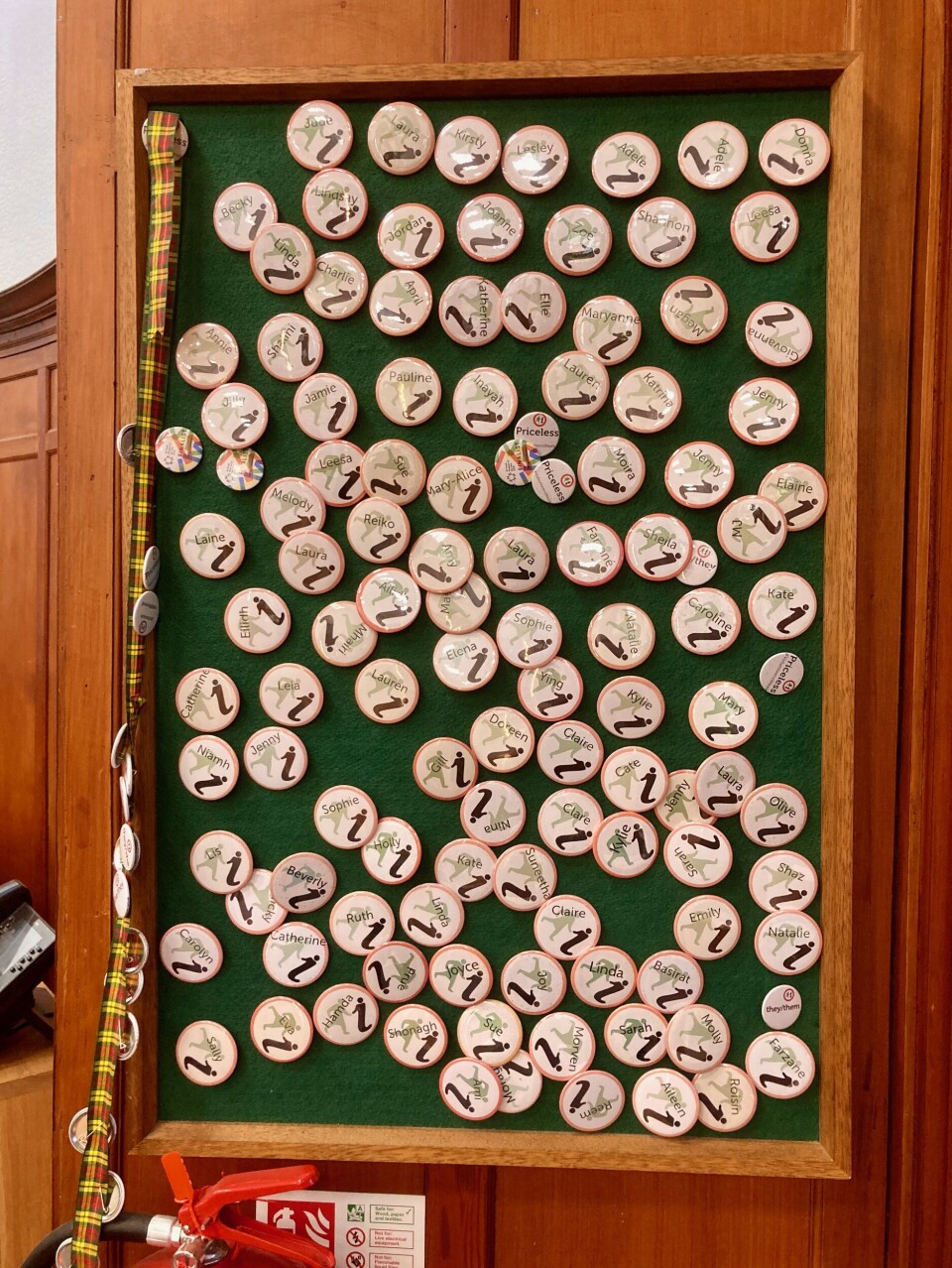 Hun deler kontor. Ikke bare med sin kollega, Glasgow Women´s Library´s arkivar, men også med forskere og andre nysgjerrige, som vil se ting fra samling og arkiv. Her er stort langbord å studere ved. Kontoret har også en fredstutstilling Noble lagte da bombingen av Gaza begynte i 2023: Glassmontere fulle av pamfletter, håndarbeid og buttons fra kvinnedrevne fred og solidaritets-kampanjer gjennom tidene, plukket fra samlingen på flere tusen objekter.